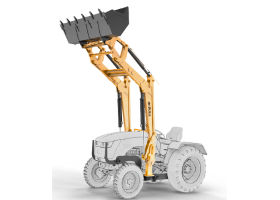 Heavy-duty loader attachment for tractors, including options like booster buckets and grabbing forks for industrial material handling. Versatile loader for heavy-duty tasks, with optional buckets and accessories.