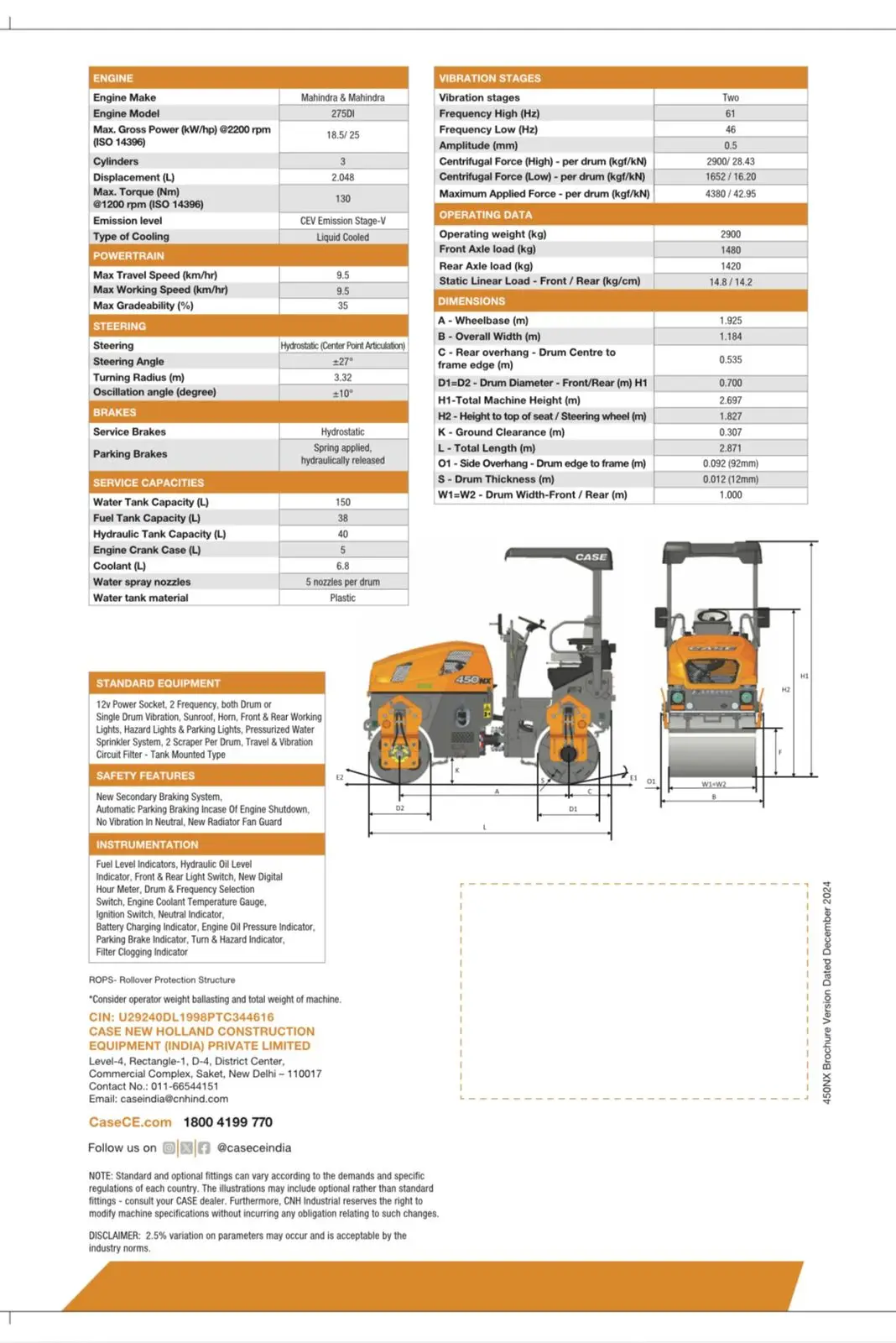 The CASE 450NX is a compact and efficient tandem vibratory compactor designed for superior road compaction in tight spaces. Powered by a Mahindra 2750 mechanical engine with CEV Stage-V compliance, it delivers exceptional performance, reliability, and fuel efficiency with a modern operator-friendly design.