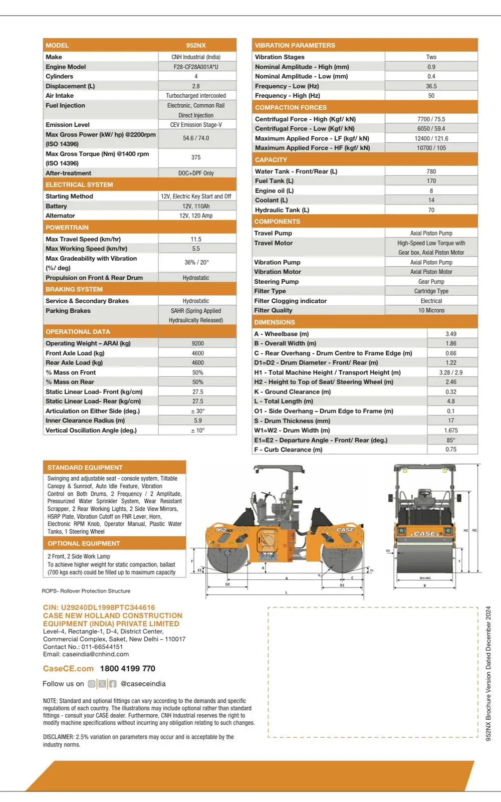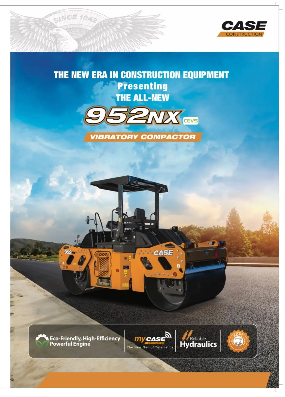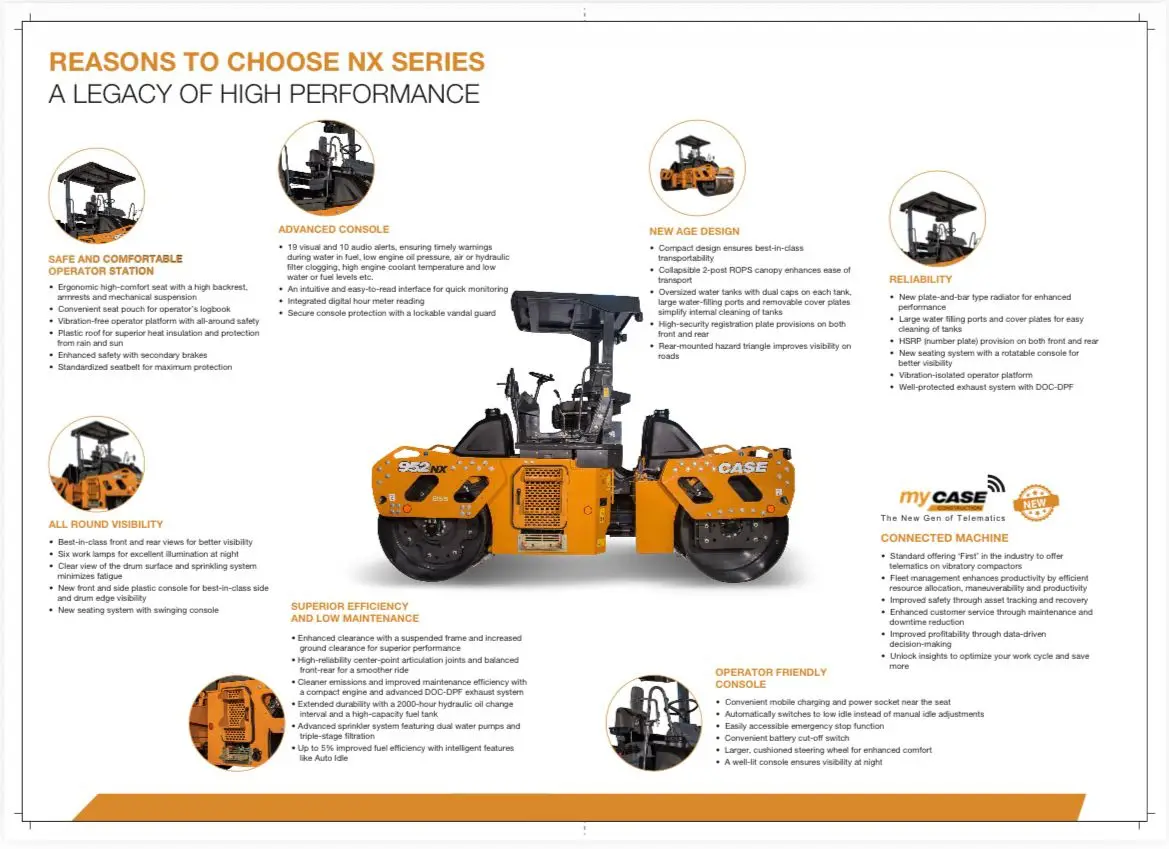 The CASE 952NX Vibratory Compactor represents a new era in road construction technology, combining power, precision, and innovation. Powered by a 54.6 kW (74 HP) F28 CEV Stage-V engine, it ensures cleaner emissions and fuel-efficient operation with a DOC+DPF system.