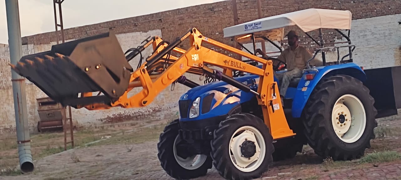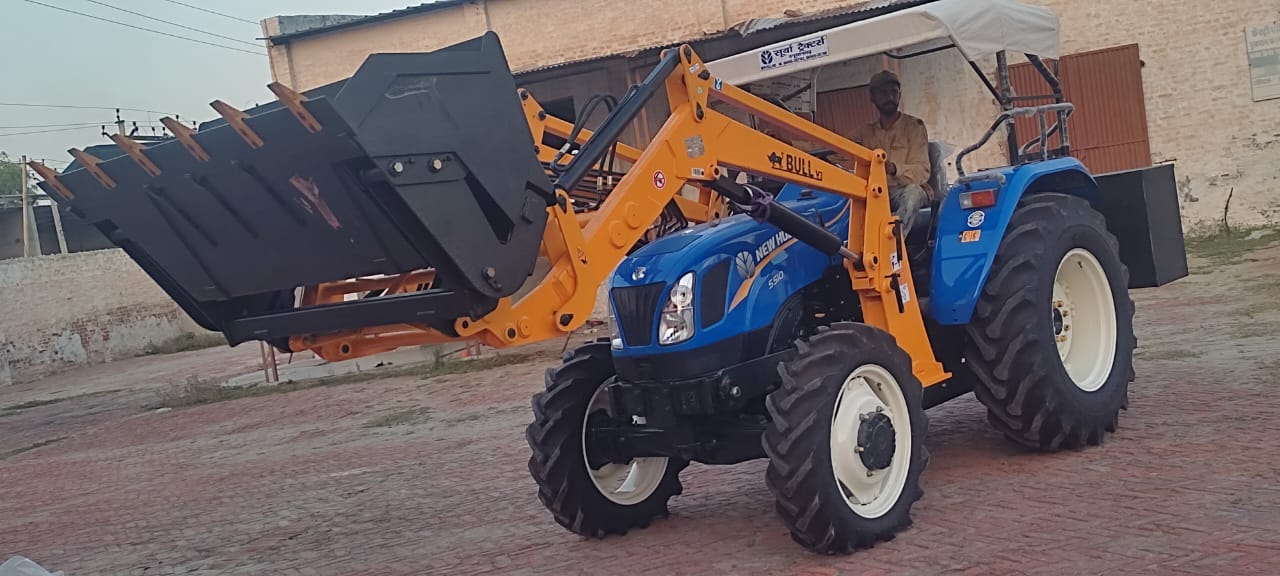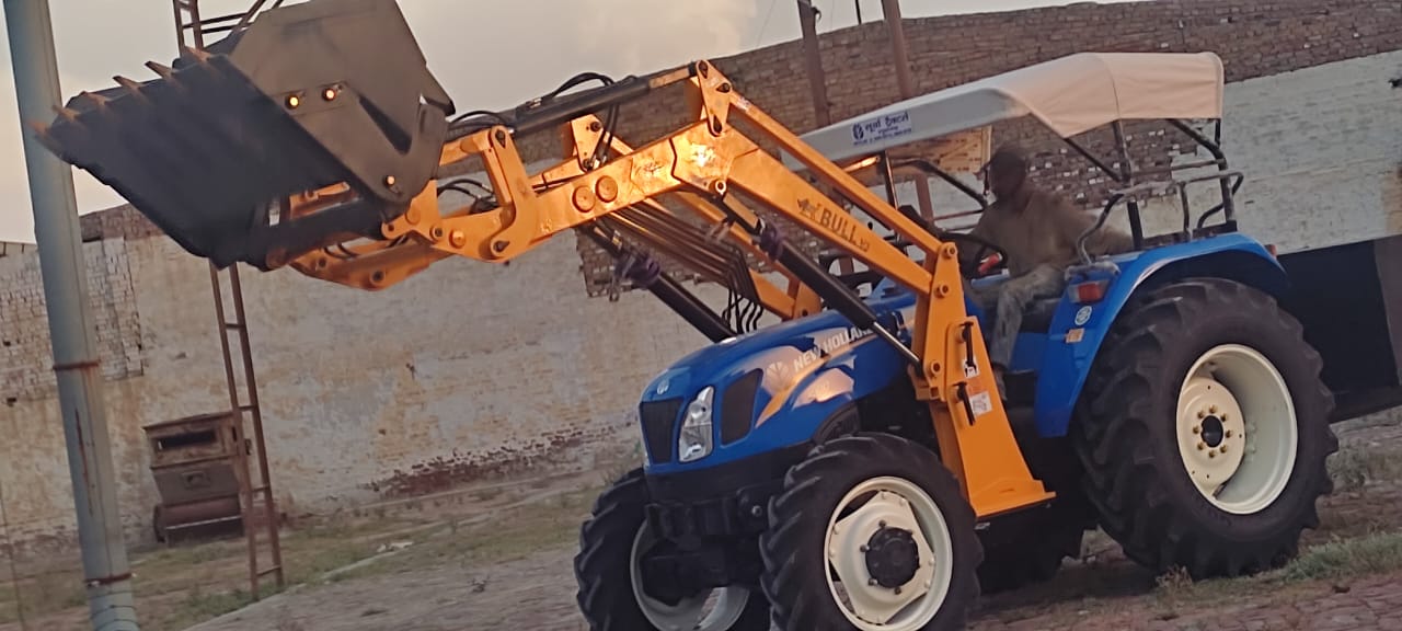 This product is a New Holland tractor outfitted with a Bull Brand loader and, in several images, a backhoe attachment—forming a versatile tractor loader backhoe (TLB) system. TLBs are highly adaptable machines widely employed across agriculture, construction, landscaping, and municipal works for tasks such as digging, trenching, loading, material handling, and leveling. In these configurations, the front loader is mounted with a multi-purpose bucket, capable of scooping, lifting, carrying, and dumping soil, aggregates, animal waste, or farm materials. The loader offers powerful hydraulic lift, tilting functions, and robust build quality, ensuring sustained operation in repeated heavy loads.